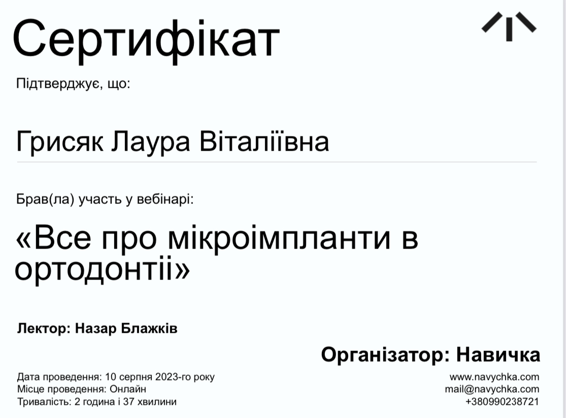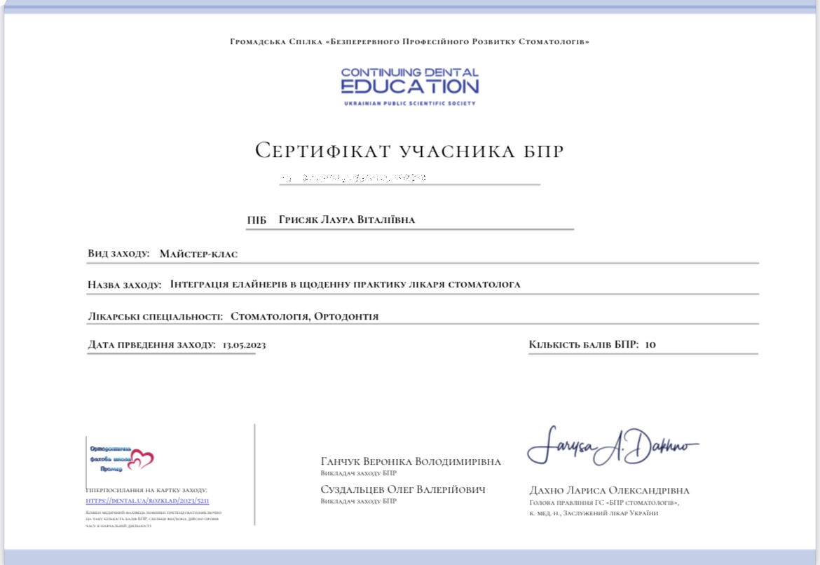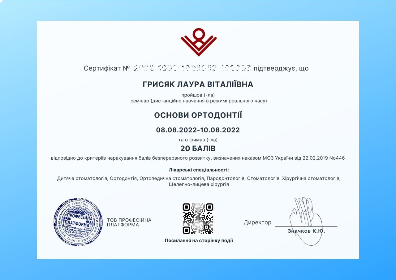 Хочемо порекомендувати ортодонта Грисяк Лауру Віталіївну. Вона встановлювала сапфірові брекети нашому старшому синові. Ми були приємно здивовані, побачивши перші результати вже за місяць! Окремий плюс — самі брекети дуже естетичні та майже непомітні на зубах, що важливо для підлітка. Лаура Віталіївна — чудовий фахівець і дуже приємний у спілкуванні лікар.